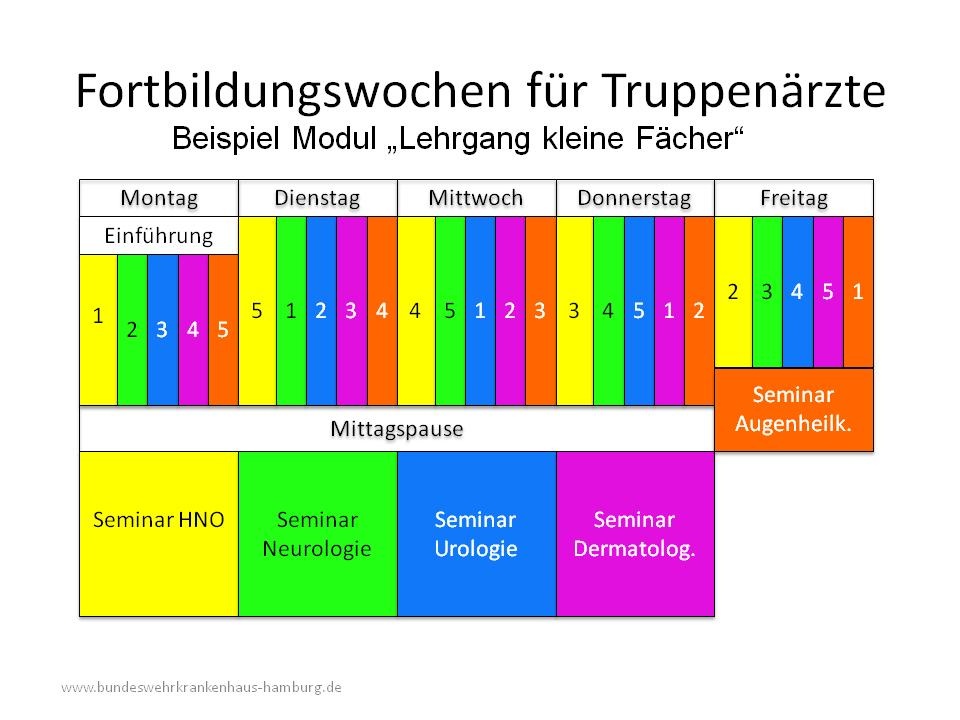 Die von truppenärztlicher Seite gewünschten Fortbildungsinhalte werden in zwei getrennt durchgeführten Lehrgangsmodulen vermittelt. Hierzu wurde als erste Maßnahme das Modul 1: „Kleine Fächer“ konzipiert. Um eine individuelle Schulung der Lehrgangsteilnehmer gewährleisten zu können, wurde bereits in der Pilotphase die Teilnahme auf insgesamt nur zehn Lehrgangsteilnehmer begrenzt. Die Lehrgangsdauer beträgt fünf Tage. Diese Fortbildung beinhaltet Hospitationen in den Fächern HNO, Urologie, Dermatologie, Neurologie und Augenheilkunde (Abb. 2, Abb. 3). Die Lehrgangsteilnehmer werden in kleinen Gruppen aufgeteilt und hospitieren jeweils zu zweit vormittags in den Ambulanzen HNO, Urologie, Dermatologie, Neurologie und Augenheilkunde im täglichen Wechsel. Nachmittags finden Seminare durch Fachärzte aus den genannten Abteilungen mit allen Lehrgangsteilnehmer eines Moduls statt (Abb. 4). In den Nachmittagsseminaren werden z. B. von der Abteilung HNO nachfolgende Lerninhalte, die bei den Umfragen von truppenärztlicher Seite angesprochen wurde, erarbeitet: