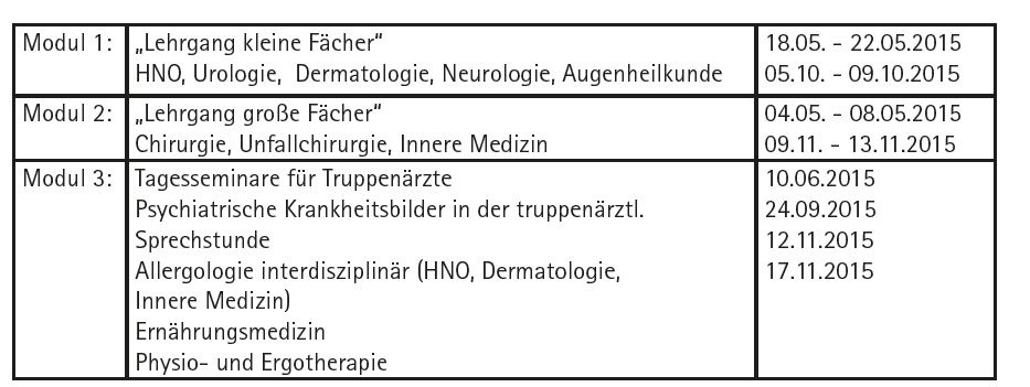 Die Termine für die Durchführung der Lehrgangsmodule und Tagesseminare sind aus Tabelle 1 ersichtlich. Während in der Pilotphase 2014 dieses Angebot in erster Hinsicht an Truppenärzte gerichtet war, die im Kommandobereich des Sanitätskommando I Dienst taten oder dem Marinesanitätsdienst angehörten, wurde diese Beschränkung für die Lehrgänge und Seminare 2015 aufgehoben.