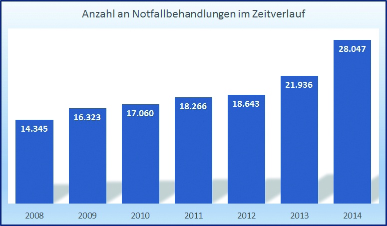 Gerade angesichts immer weiter ansteigender Zahlen an Patientenkontakten in unseren Notaufnahmen (2014 waren in den Not-aufnahmen bundesweit schätzungsweise 20 Millionen Patien-tenkontakte zu verzeichnen, das ist ein Viertel der Gesamtbevölkerung!) braucht es dringend Konzepte, um angepasst, sinnvoll und insbesondere patienten- und erkrankungsorientiert vorgehen zu können. Auch die ZINA des BwKrhs Hamburg verzeichnet kontinuierlich ansteigende Patientenzahlen (Abbildung 2). Leider sieht der Alltag in vielen deutschen Notaufnahmen oft noch anders aus. Eine spezielle fachliche Qualifikation aller an der Versorgung Beteiligten – von der Administration über die Triagierung, Diagnostik, Therapie und Entscheidungsfindung – bildet meist noch die Ausnahme.