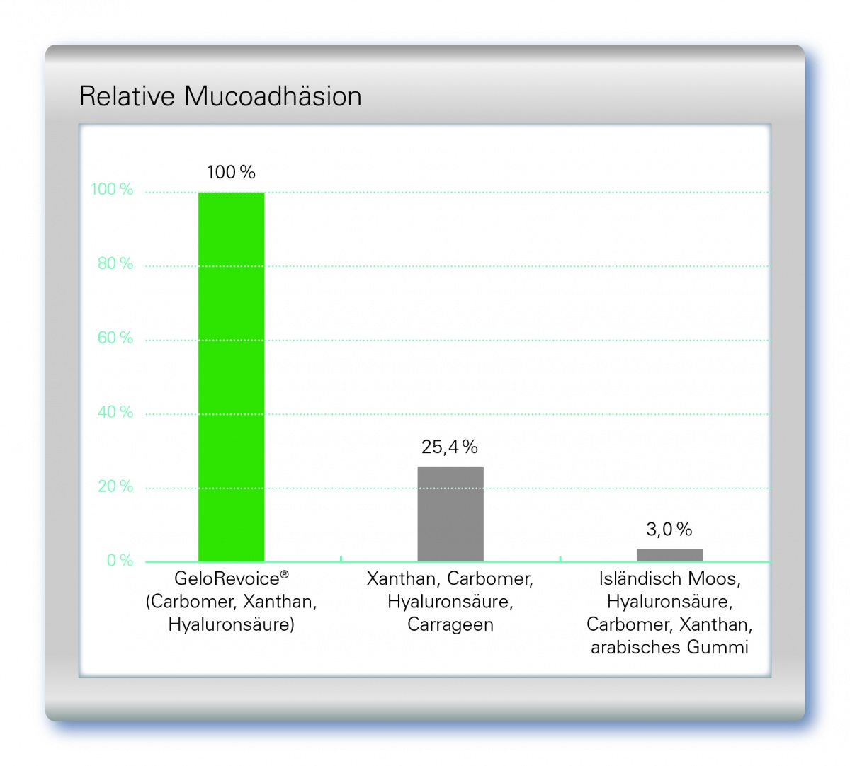 Eine aktuelle Untersuchung verifiziert die subjektiv empfundene lange Verweildauer auch objektiv – insbesondere im Vergleich mit Wettbewerbsprodukten: Im Rahmen des DIN-genormten Versuchs zeigte GeloRevoice® im Vergleich mit einer Kombination aus Xanthan, Carbopol, Hyaluronsäure und Carrageen ebenso wie mit einer Pastille auf Basis von Isländisch Moos, Hyaluronsäure, Carbomer, Xanthan und Gummi arabicum die höchste relative Viskosität – und damit stärkste Feuchtigkeitsbindung. Überdies zeigte GeloRevoice® eine vier- bis 33-fach höhere Mucoadhäsion als die Vergleichspräparate (Abbildung 2) [1]. Diese Ergebnisse belegen, dass GeloRevoice® für eine nachhaltige Befeuchtung der Schleimhaut sorgt. Vielsprecher und Sänger profitieren somit von einem länger anhaltenden therapeutischen Effekt.