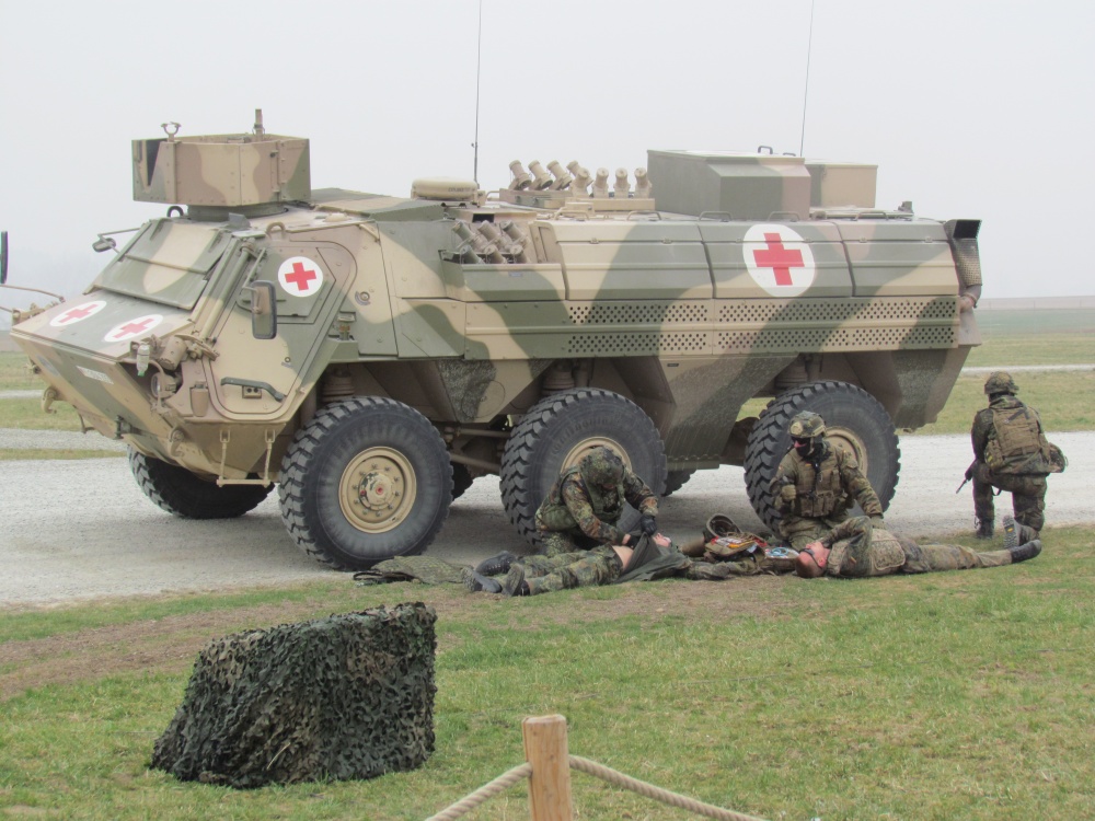 Ziel der dynamischen Vorführungen bei der Informationslehrübung des Sanitätsdienstes ist es, sanitätsdienstliche Vorgehensweisen – gerade in Gefechtssituationen – aber auch die Leistungsfähigkeit und Komplexität der Rettungskette im Einsatz aufzuzeigen (Abb. 4). Anpassung der medizinischen Abläufe an die militärische Situation und die taktischen Notwendigkeiten stehen dabei deutlich im Vordergrund. Ein gleichem Maße werden aber auch die Limitationen und die damit verbundenen Abhängigkeiten zu anderen Einsatzelementen, wie z. B. Sicherung, Logistik und Führungsunterstützung aufgezeigt und damit die sanitätsdienstliche Einsatzversorgung in den Kontext des militärischen Gesamtsystems Einsatz eingebettet.
