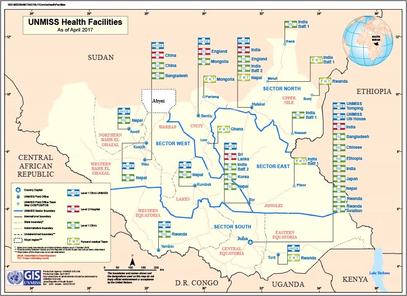 Die chirurgische und fachärztliche Versorgung erfolgt in vier Level 2 clinics in JUBA und MALAKAL durch Indien, durch Sri-Lanka in BOR, durch China in WAU und Vietnam in BENTIU.