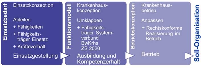 Die Komplexität der dargestellten Wechselbeziehungen bedingt auch eine adaptierte multimodale Vorgehensweise in der Erstellung der Zielstruktur 2020. Der Abteilung C im Kommando Sanitätsdienst der Bundeswehr kommt hierbei mit den Schwerpunkten Krankenhausmanagement, Grundsatzforderungen und Management von Gesundheitseinrichtungen eine koordinierende Rolle in der Zielentwicklung der fünf Bundeswehrkrankenhäuser als Elemente eines Systemverbunds zu.