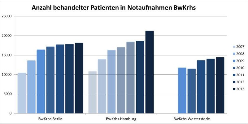 Eine Weiterentwicklung des Systemverbundes der Bundeswehrkrankenhäuser im Rahmen der Zielstruktur 2020 ist sowohl zur nachhaltigen Auftragserfüllung als auch zur zukunftsfähigen Integration in einem um Patienten konkurrierenden zivilen Gesundheitssystem zwingend erforderlich. Der zunehmende wirtschaftliche Druck, der auf den zivilen Krankenhäusern in Deutschland lastet1, bedingt hierbei die stringente Orientierung an zivilen Qualitätsvorgaben und Standards, um in diesem Wettbewerb auch zukünftig noch die notwendige Attraktivität der Behandlungsstätten für alle Patienten und auch Einweiser darzustellen. Die gleichzeitig steigende Inanspruchnahme der deutschen Krankenhäuser im Rahmen der Versorgung von Notfällen und Akuterkrankungen2 bedingt ebenfalls eine Anpassung der Binnenstruktur und grundlegenden eigenen medizinischen Leistungsprozesse.