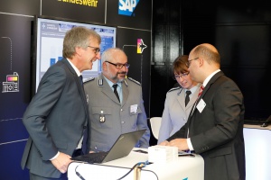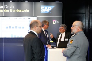 Die sich anschließende Podiumsdiskussion wurde diesmal durch fünf Vertreter bestritten. Unter dem Motto „Digitalisierung der Gesundheitsversorgung der Bundeswehr, wo stehen wir, wie können wir unterstützen“ diskutierten Flottenarzt Dr. Heßler-Hammerstein, IT Systemarchitekt vom BAAINBw, Dr. Michael Trampert von der BWI, Herr Til Moysies, Leiter des Streams Prozessarchitektur im Programm Digit. GesVersBw, Herr Dr. Gero Lurz von der SAP AG und Herr Stefan Born, Geschäftsführer der NEXUS AG das Thema aus unterschiedlichen Blickwinkeln auch bezüglich der durch die Industrie beizusteuernden heutigen technischen Möglichkeiten für die Umsetzung des Programms in den nächsten Jahren.