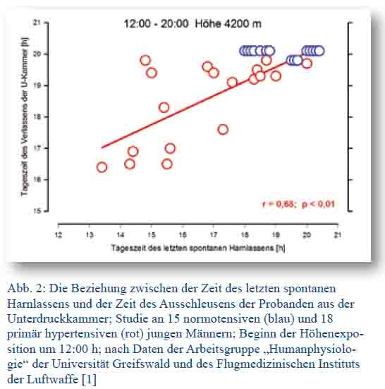 In diesen Experimenten wurden klinisch gesunde normotensive junge Probanden und altersgleiche aber familiär mit primärer Hypertonie belastete Männer in einer Unterdruckkammer (U-Kammer) für acht Stunden einer simulierten Höhe von 4200 m ausgesetzt [1]. Alle Normotensiven tolerierten diese Höhe über die volle Zeit, aber nur 10 der ursprünglich 18 Hypertensiven beendeten die Höhenexposition nach Zeitplan [1]. Die ersten der hypertensiven Probanden verlangten, beginnend nach drei – vier Stunden in der Höhe, wegen Kopfschmerzen, Sehstörungen und Übelkeit – alles Symptome einer zentralnervösen Irritation – die U-Kammer zu verlassen. Dem dann erfolgenden Ausschleusen ging immer ein Versiegen der Urinexkretion voraus (Abb. 2).