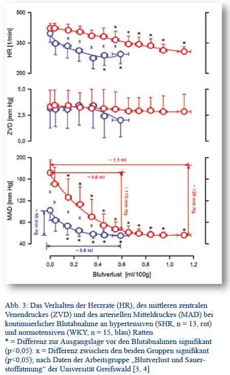 Abb. 3: Das Verhalten der Herzrate (HR), des mittleren zentralen Venendruckes (ZVD) und des arteriellen Mitteldruckes (MAD) bei kontinuierlicher Blutabnahme an hypertensiven (SHR, n = 13, rot) und normotensiven (WKY, n = 15, blau) Ratten * = Differenz zur Ausgangslage vor den Blutabnahmen signifikant (p<0,05). x = Differenz zwischen den beiden Gruppen signifikant (p<0,05); nach Daten der Arbeitsgruppe „Blutverlust und Sauerstoffatmung“ der Universität Greifswald [3, 4]