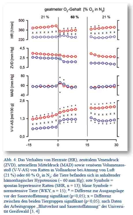 Abb. 4: Das Verhalten von Herzrate (HR), zentralem Venendruck (ZVD), arteriellem Mitteldruck (MAD) sowie venösem Volumenausstoß (V-V-AS) von Ratten in Vollnarkose bei Atmung von Luft (21 %) oder 60 % O2 in N2; die Tiere befanden sich in anhaltender hämorrhagischer Hypotension (~ 60 mm Hg); rote Symbole = spontan hypertensive Ratten (SHR, n = 13); blaue Symbole = normotensive Tiere (WKY, n = 15); * = Differenz zur Ausgangslage vor der Sauerstoffatmung signifikant (p<0,05); x = Differenz zwischen den beiden Tiergruppen signifikant (p<0,05); nach Daten der Arbeitsgruppe „Blutverlust und Sauerstoffatmung“ der Universität Greifswald [3, 4]