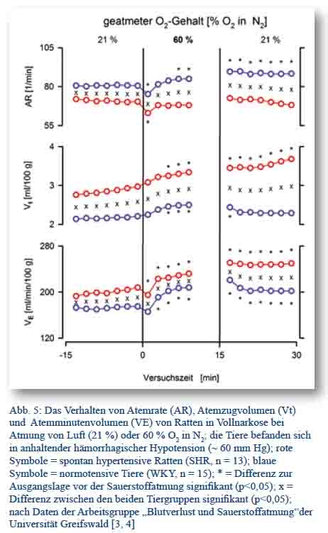 Abb. 5: Das Verhalten von Atemrate (AR), Atemzugvolumen (Vt) und Atemminutenvolumen (VE) von Ratten in Vollnarkose bei Atmung von Luft (21 %) oder 60 % O2 in N2; die Tiere befanden sich in anhaltender hämorrhagischer Hypotension (~ 60 mm Hg); rote Symbole = spontan hypertensive Ratten (SHR, n = 13); blaue Symbole = normotensive Tiere (WKY, n = 15); * = Differenz zur Ausgangslage vor der Sauerstoffatmung signifikant (p<0,05); x = Differenz zwischen den beiden Tiergruppen signifikant (p<0,05); nach Daten der Arbeitsgruppe „Blutverlust und Sauerstoffatmung“der Universität Greifswald [3, 4]
