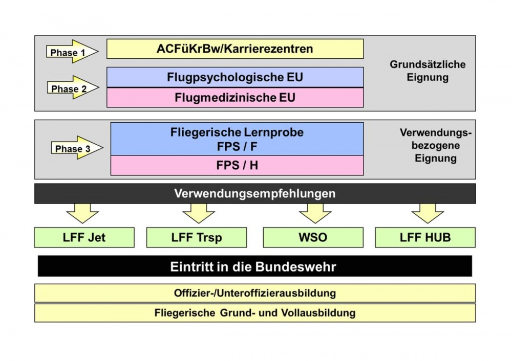 - die Eignungsfeststellung für Bewerber i. d. R. vor Eintritt in die Bundeswehr abgeschlossen ist, was die Attraktivität des Fliegerischen Dienstes deutlich gesteigert hat, da dem Bewerber dadurch Planungssicherheit gegeben wird[1], und