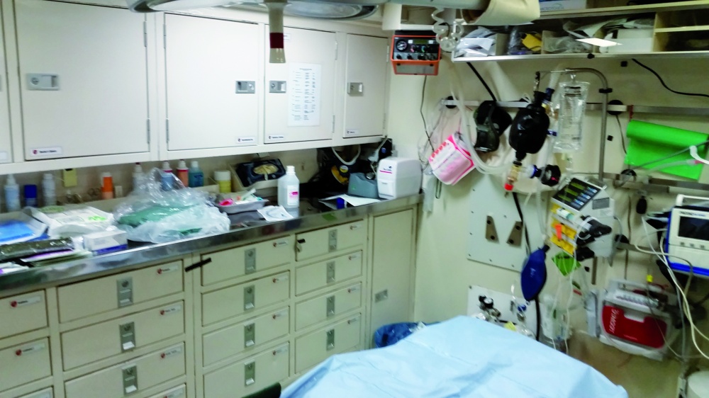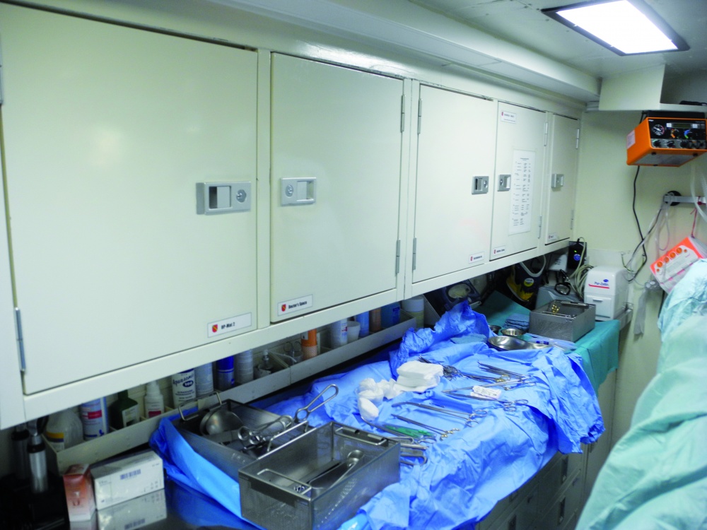 Zuletzt ist die Infrastruktur des Schiffslazaretts zu beachten. Es herrschen enge räumliche Verhältnisse, welche trotz der Bewegungsmöglichkeiten des OP-Tisches nur unwesentlich beeinflusst werden können. Mobile, höhenverstellbare Beistelltische für den Instrumenteur existieren nicht und die vorhandenen Absauggeräte sind Notfallabsauggeräte und nicht mit Geräten mit zentraler Vakuumversorgung in Krankenhaus-OP-Sälen vergleichbar. Eine weitere Besonderheit liegt darin, dass die verwendeten Geräte und Materialien seefest gelagert werden müssen, da Seegang und Ruderlagen Einfluss auf die Schiffsbewegungen haben (Abbildung 3).