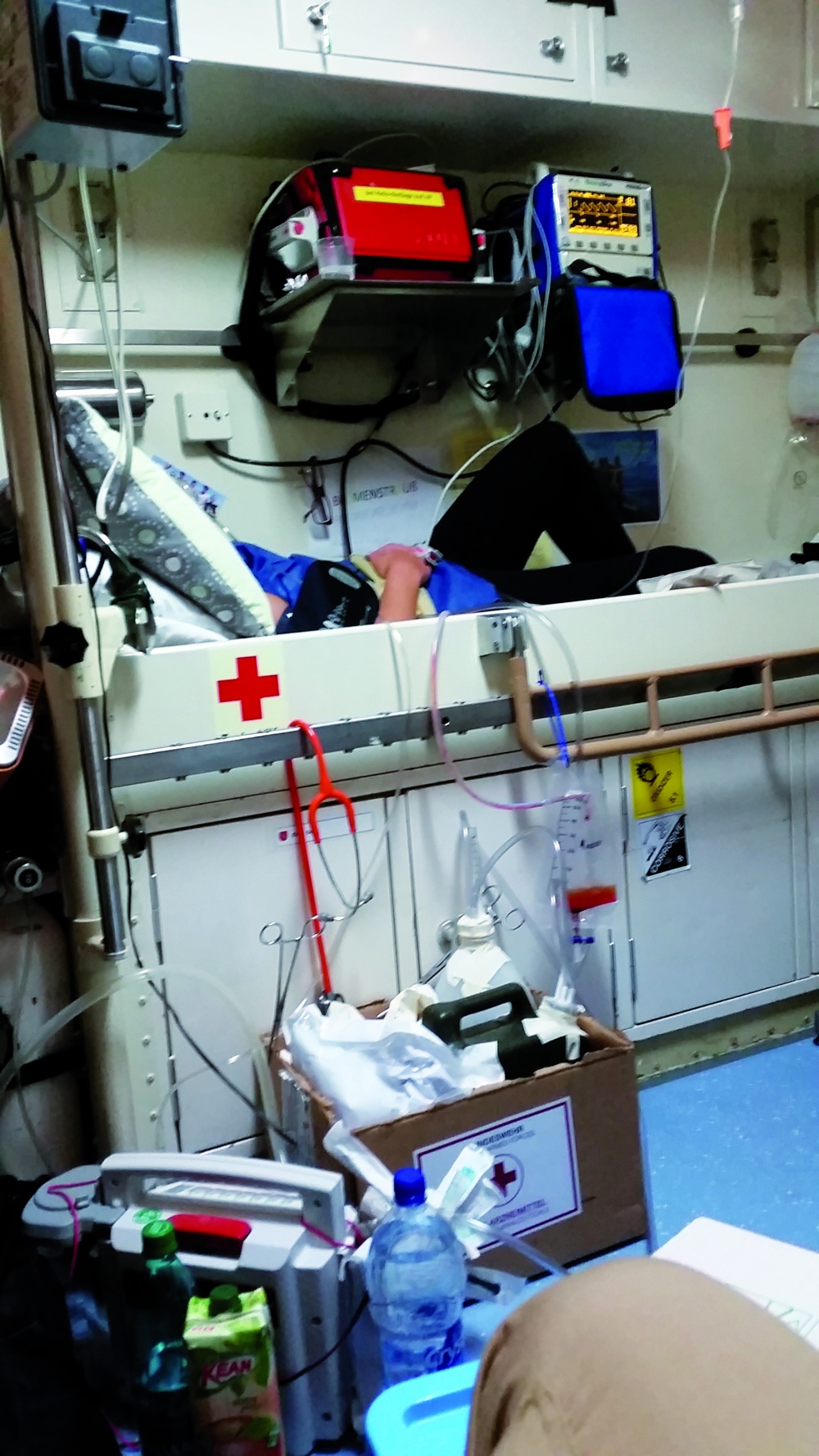 Abb. 2: Patientin in der „Intensiv-Koje“, versorgt mit Thoraxdrainage samt improvisiertem Wasserschloss und Vakuumsystem