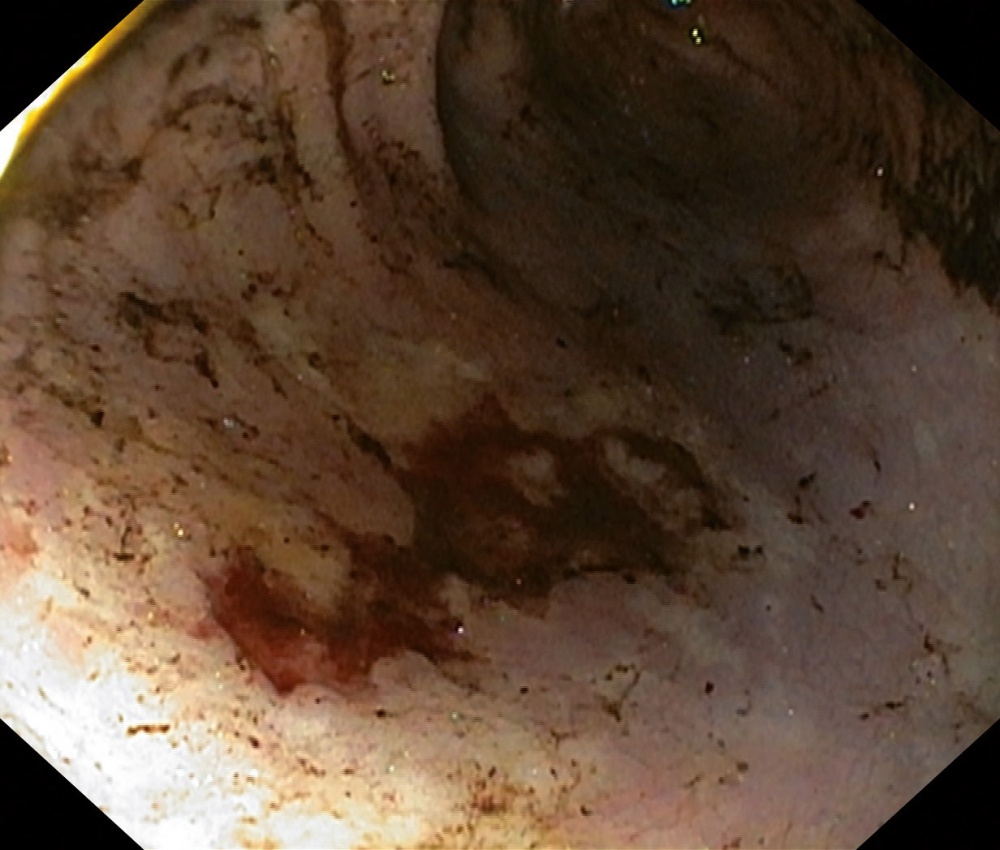 Unmittelbar nach Einführen des Gastroskops erbrach der Patient etwa 1 l mit Hämatin durchsetzter Flüssigkeit, die mit dem therapeutischen Endoskop zum Teil bereits im Ösophagus abgesaugt werden konnte. Eine Aspiration des in Linksseitenlage befindlichen Patienten zeigte sich nicht, sodass die Untersuchung nach Absaugen der Flüssigkeit bei stabilen Herz-Kreislaufverhältnissen und peripheren O2-Sättigungswerten über 95 % weiter durchgeführt werden konnte.