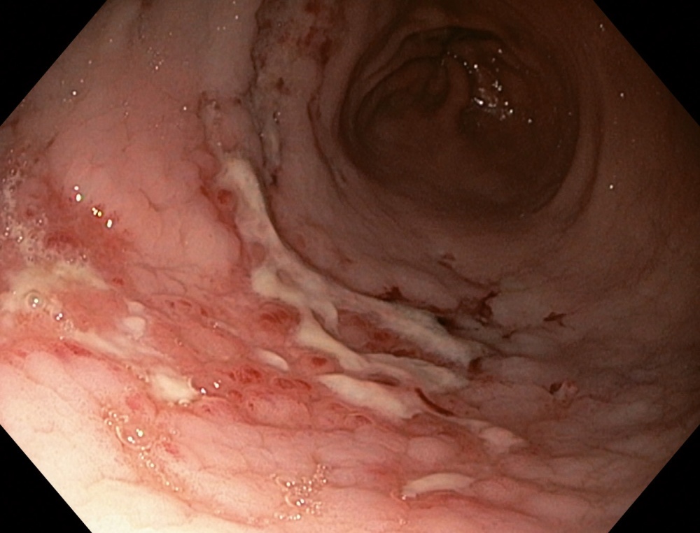 Bei erneutem Erbrechen von Hämatin und frischen blutigen Anteilen erfolgte aufgrund der Anamnese und der unklaren Situation die Entscheidung zur Notfallendoskopie.