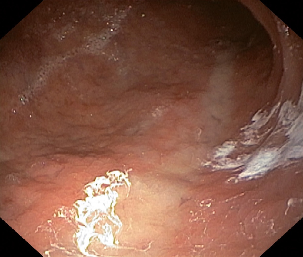 Nach Applikation von drei Sprühstößen waren die beschriebenen Schleimhautläsionen vollständig mit Hemospray™ bedeckt, und es bestanden keine Blutungszeichen mehr (Abbildung 2). Aufgrund eines unzureichenden Abstandes zur Magenwand wurde während der Sprühstöße die Optik des Endoskops getroffen, wodurch die Sicht eingeschränkt wurde.