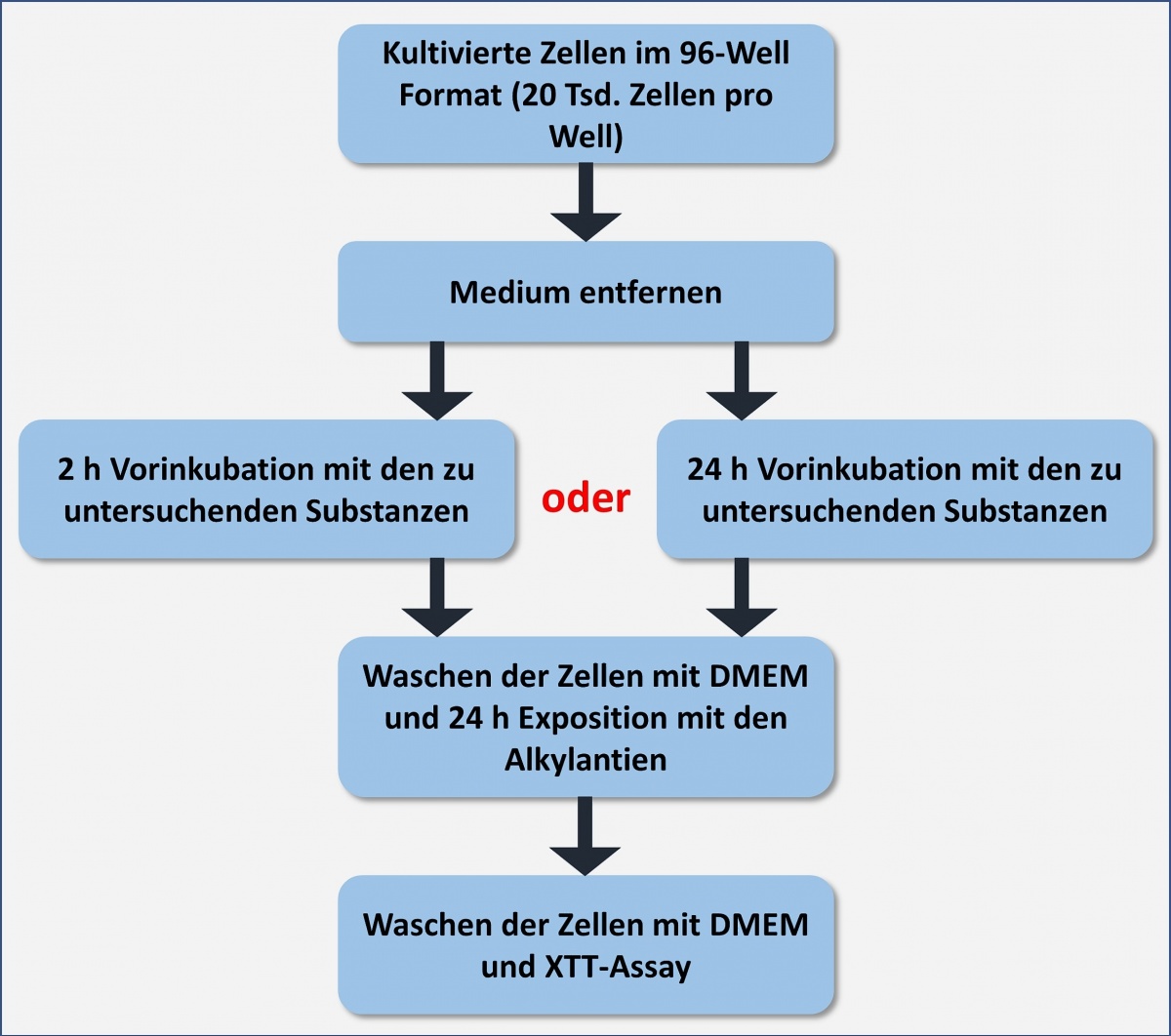 Zu Beginn der Arbeit wurde die Zellzahl für das gewählte Testsystem optimiert. Anschließend konnte mit dem Testsystem die Verträglichkeit (Toxizitätsbestimmungen, Ermittlung der LC50) der zu untersuchenden Nahrungsmittel, Supplemente und Alkylanzien bestimmt werden. Die Ermittlung des Endpunkts der Zellzahloptimierung sowie die Verträglichkeitsuntersuchungen erfolgten über die Messung der Zellviabilität mittels eines modifizierten Tetrazoliumtests (XTT-Assay; Cell Proliferation Kit II XTT von Roche® Apllied Life Science). Die Grundlage eines Tetrazoliumtests basiert auf der enzymatischen Reduktion eines Tetrazols in ein Formazan, welches anschließend photometrisch bestimmt werden kann. Dieses setzt einen funktionellen mitochondrialen Metabolismus der Zellen voraus. Die Zellviabilität ist ein Surrogatmarker für die Vitalität einer Zelle und beschreibt den Anteil von lebensfähigen Zellen innerhalb einer Population. Dabei wird das Tetrazol von zelleigenen Enzymen reduziert und der entstandene Komplex photometrisch gemessen. Je mehr Zellen lebensfähig sind, desto höher ist die gemessene Absorption.