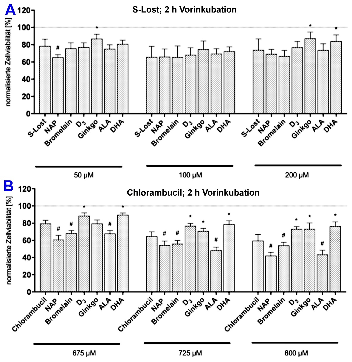 Results: Ginkgo extract, vitamin D3 and docosahex-aenoic acid treatment increased cell viability compared to chlorambucil- or SM-exposed sham-treated controls. To elucidate the molecular toxicology of alkylating agents in more detail, various cellular signaling pathways were investigated. Ginkgo, vitamin D3 and docosahexaenoic acid exhibited antiapoptotic effects on exposed cells.