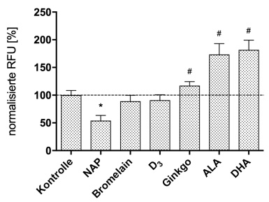 Zusätzlich wurde die oxidative Kapazität der Testsub-stanzen untersucht. Dabei sollten etwaige antioxidative Eigenschaften der Nahrungsmittel und Supplemente identifiziert werden. Wie in Abbildung 3 erkennbar, zeigte nur NAP eine Senkung der normalisierten relativen Fluoreszenz (RFU). Das bedeutet, dass einzig NAP ein antioxidatives Potenzial besitzt. Entgegen der allgemeinen Darstellung in der Literatur [25, 10] zeigten Ginkgo, ALA und DHA sogar eine Steigerung der Bildung freier Radikale, welche einen möglichen Zellschaden ver-ursachen könnten. Dieser Effekt ist mit einer Erhöhung der normalisierten RFU gekennzeichnet (siehe Abbildung 3).