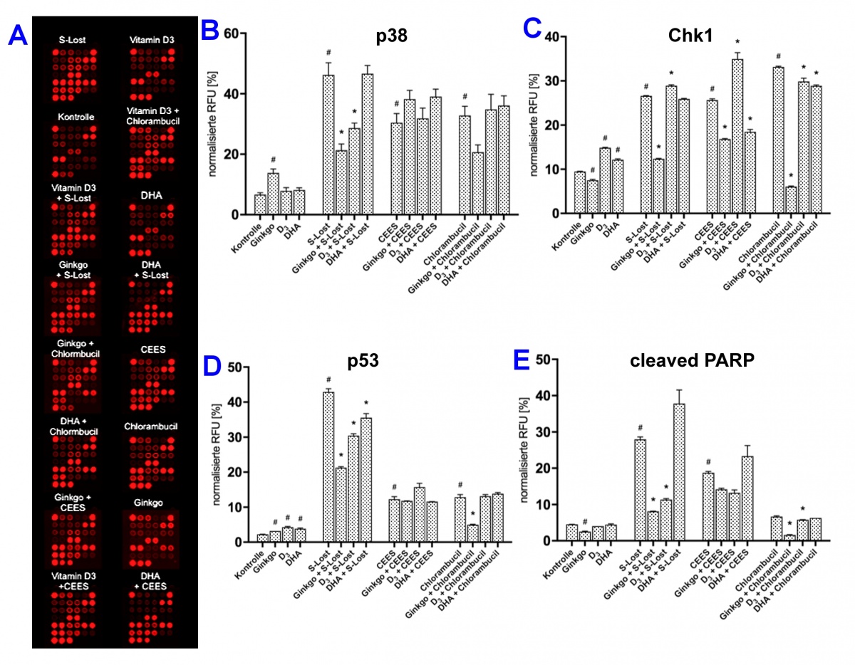 S-Lost induziert Apoptose und beeinflusst andere Stoffwechselkaskaden [13]. Um diese teilweise unbekannten Mechanismen genauer zu untersuchen, wurden Prote-ine verschiedenster Stoffwechselvorgänge oder Signalkaskaden qualitativ bestimmt. Dazu wurden immunologische Screening-Tests (PathScan-Array; PathScan® Stress and Apoptosis Signaling Antibody Array Kit und PathScan® Intracellular Signaling Array Kit von Cell Signaling) durchgeführt. Bei diesen Sandwich-Immuno-assay befindet sich ein primärer Antikörper auf einer Nitrocellulose-Membran. Die Zielproteine binden diesen und werden anschließend von einem sekundären Antikörper erfasst. In einem weiteren Reaktionsschritt wird dieser mit einem Fluoreszenzmarker versetzt, welcher photometrisch detektiert werden kann. Der Einfluss der drei Supplemente (Ginkgo, DHA und Vitamin D3), welche einen nachweislichen Einfluss auf die S-Lost-, CEES- und Chlorambucil–induzierte Zellschäden hatten, wurde untersucht.