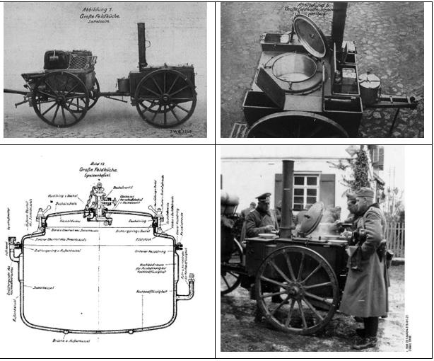 Diese Feldküchen wurden unverändert von der Reichswehr und der Wehrmacht übernommen und auch im 2. Weltkrieg genutzt (Abbildung 2). Zudem kamen auch die im jeweiligen Krieg erbeuteten Feldküchen zum Einsatz.
