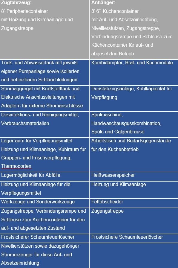 Ausgehend von den o. a. notwendigen Fähigkeiten der Ausstattung der mobilen Feldküche sind folgende Systeme und Ausrüstungen für die Zubereitung von Speisen geplant: