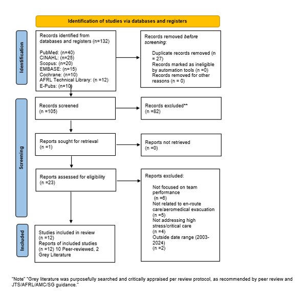 A systematic search was conducted across PubMed, CINAHL, Scopus, EMBASE, Cochrane, AFRL Technical Library, DOD E-Pubs, the Joint Trauma System Clinical Practice Guideline (CPG) repository, and DTIC, including literature published from 2003 to 2024. The search strategy employed key terms: (“en-route critical care” OR “aeromedical evacuation” OR “ERC team” OR “critical care transport”) AND (“team performance assessment” OR “competency evaluation” OR “teamwork measurement” OR “simulation” OR “non-technical skills”) NOT (“emergency department” OR “hospital” OR “ICU”). Filters were set to include only English-language, human subject studies within the specified date range 1 ,6, 7.