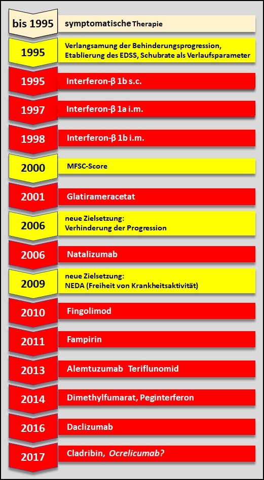 Abb. 1: Fortschritte in der MS-Behandlung (gelb: Meilensteine in