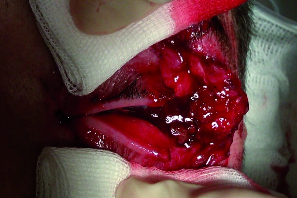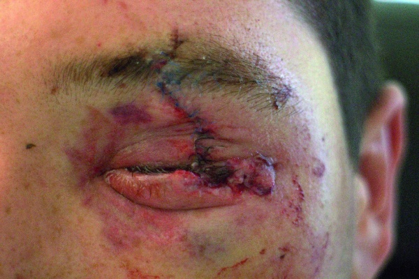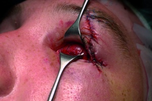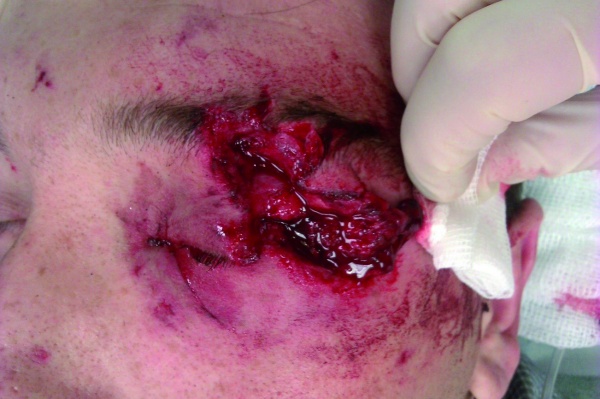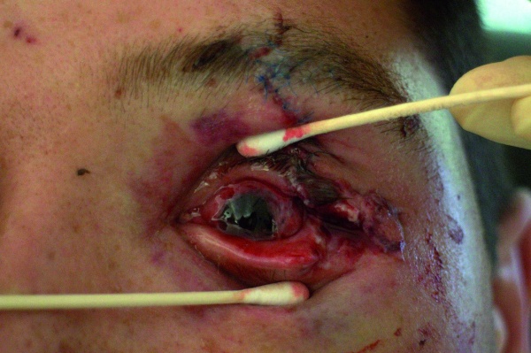 Ironischerweise nicht an Sylvester, sondern an einem August-abend sägt ein junger Mann einen großen Feuerwerks-Kanonenschlag in zwei Hälften und zündet ihn an. Durch das Teilen des Böllers kommt es nicht wie angenommen zu einer Abschwächung der Sprengkraft. Durch die Explosion erleidet der Patient linksseitig Frakturen an Orbitadach, -wand und -boden, einen kompletten lateralen Ausriss des Ober-und Unterlides und eine Risswunde der Augenbraue, die in der Tiefe die obere Orbitakante freilegt. Am schwerwiegendsten ist aber eine Bulbusruptur mit Einsprengung von grauem Pappmaterial, wie es in Feuerwerkskörpern Verwendung findet (siehe Abbildung 1 und 2). Solch eine Verletzung durch explosives Material erinnert an Verletzungsmuster durch Improvized Explosive Devices (IED), wie sie u.a. in Afghanistan eingesetzt werden.