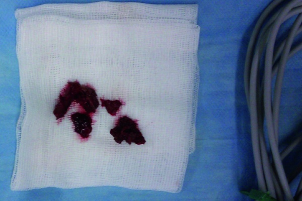 Nach einer sorgfältigen Wundreinigung und Entfernung von Schwarzpulverresten sowie Pappstücken erfolgt die notfallmäßige Primärversorgung. Die tiefe Risswunde der Augenbraue wird schichtweise verschlossen, die Kontinuität der sternförmig klaffenden Augenbraue plastisch rekonstruiert (siehe Abbildung 3). Auf eine Rekonstruktion der Lider mit lateraler Aufhängung wird verzichtet, um eine zu erwartende spätere Revisionsoperation des Auges nicht zu beeinträchtigen. Nach zirkulärer Eröffnung der Bindehaut am Limbus zeigt die Exploration noch weitere schichtweise gerollte Pappfragmente (Abbildung 4 zeigt die entfernten Pappfremdkörper), die lateral im Bulbus stecken und zwei laterale Sklerarisse. Auch die Hornhaut weist einen horizontalen, lamellierenden Riss auf. Nun werden, soweit es in der Tiefe möglich ist, Skleranähte nach Reposition von uvealem Gewebe durchgeführt. Dabei wird der Musculus rectus lateralis dargestellt, neben und teils unter dem sich der Sklerariss fortsetzt. Ein vollständiger Verschluss der Sklera ist aufgrund der Ausdehnung der Sklerarisse in der Tiefe nicht möglich. Im Anschluss erfolgt die Naht der Hornhaut nach Stellen des Bulbus mit BSS (balancierte sterile Salzlösung zur intraokularen Anwendung) und der Vorderkammer mit Healon GV®. Schließlich wird die Bindehaut soweit möglich wieder adaptiert (Operationsergebnis siehe Abbildung 5).