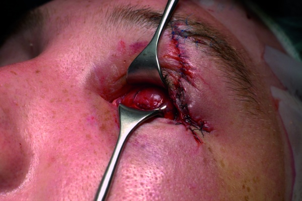 Im Rahmen der Sekundärversorgung erfolgt die Eviszeratio bulbi [2] mit Entfernung des gesamten uvealen Gewebes und die Versorgung mit einer Hydroxylapatitplombe. Die Hydroxylapatitplombe wird als Volumenauffüllung in den verbliebenen Lederhautsack eingenäht. Bei der Implantation der Plombe stellt sich heraus, dass die Linse nicht auffindbar ist; sie muss bereits durch das Trauma nach außen verlagert worden sein. Im letzten Schritt werden Oberlid und Unterlid lateral an verbliebenen Lidbandstrukturen bzw. am Periost befestigt (Operationsergebnis siehe Abbildung 6). Es zeigt sich ein kosmetisch zufriedenstellendes Operationsergebnis mit komplettem Lidschluss und ausreichend tiefen Fornices für den angestrebten sicheren Sitz einer Prothese. Abbildung 7 zeigt die mit Bindehaut gedeckte, mit Sklera ummantelte Plombe.