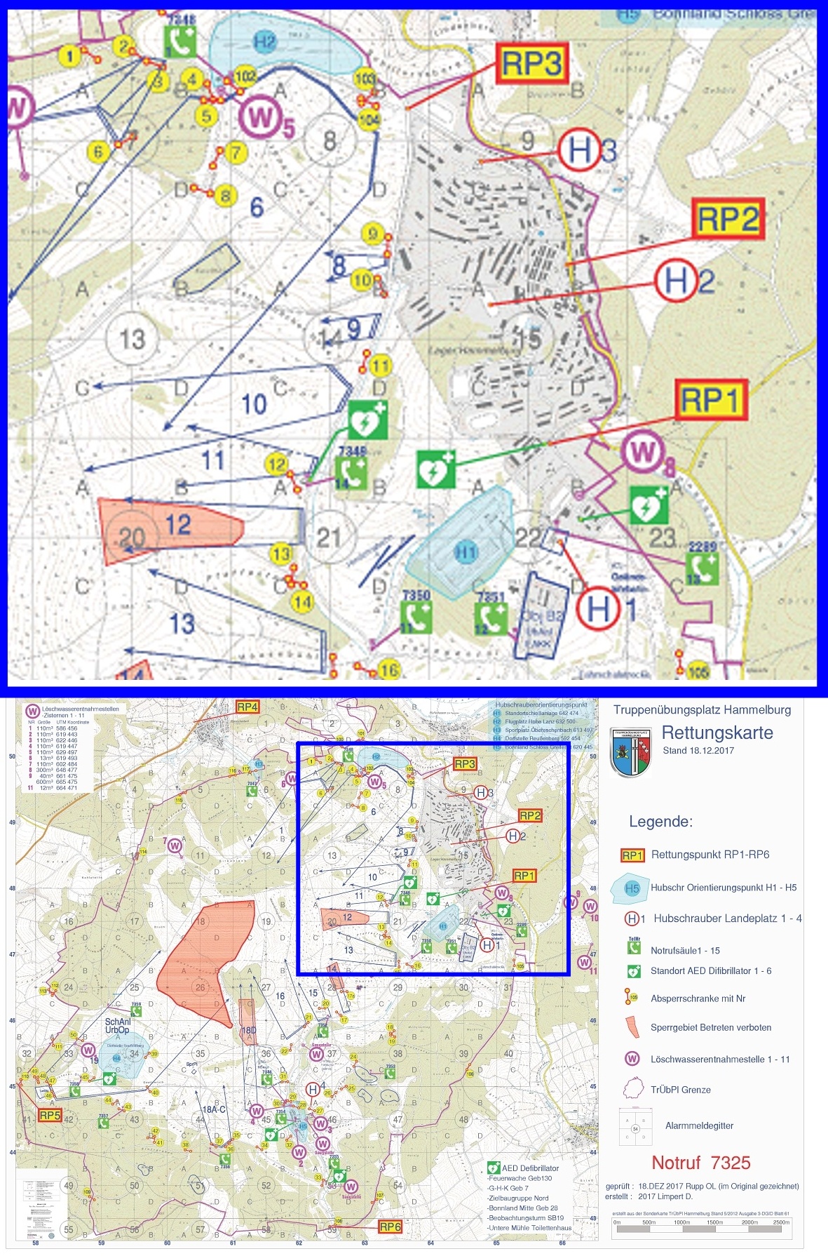 oben zeigt das Lager Hammelburg. (RP = Rettungspunkt; H = Hubschrauberlandeplatz)