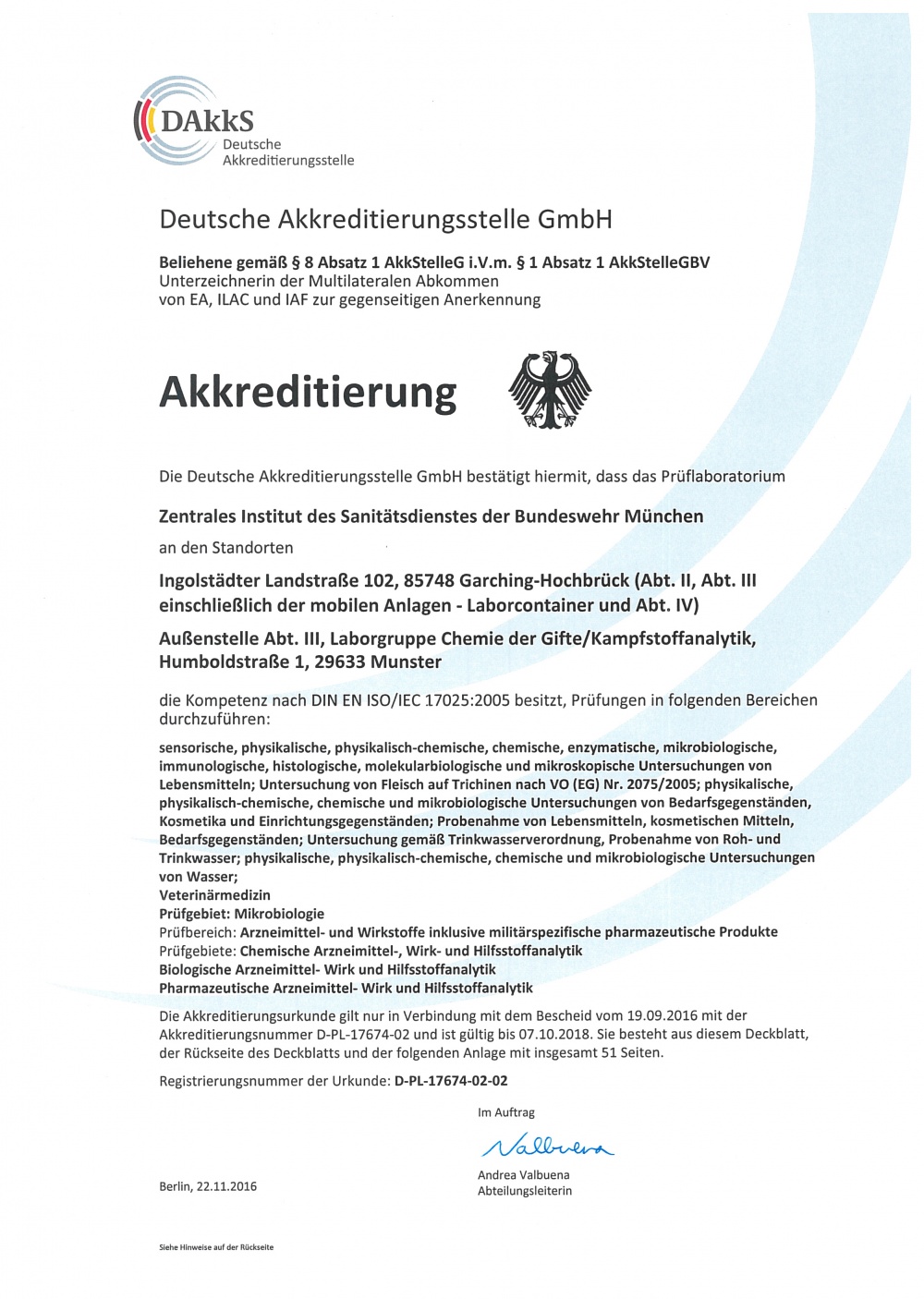 Auch die Weiterbildung der Sanitätsoffiziere zu Fachärzten für Mikrobiologie und Laboratoriumsmedizin, Fachtierärzten für Mikrobiologie oder Lebensmittel sowie zu Fachapothekern für Toxikologie und Ökologie oder Pharmazeutische Analytik ist am ZInstSanBw München möglich. Eine Übersicht der in den Jahren 2015 und 2016 in Weiterbildung befindlichen Sanitätsoffiziere sowie der Weiterbildungsermächtigten ist in Tabelle 2 dargestellt.