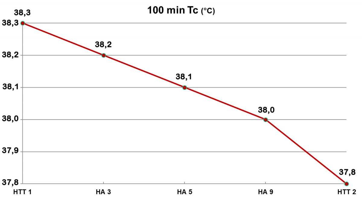 HA data from a US Air Force (USAF) thermal stress research protocol [6, 30] demonstrate the above. Eight males (age 27.2 ± 4.8 yrs, mass 72.3 ± 8.4 kg, maximum oxygen uptake (VO2 max) 55.1 ± 6.6 ml O2 kg-1 min-1) completed heat tolerance tests (HTT 1 and HTT 2) before and after nine consecutive days of HA. Both the HTT and HA trials consisted of 100 minutes walks at 25 % VO2 max in hot-humid conditions 43.1 ± 0.1 °C DB (dry bulb), 50.0 ± 0.1 % relative humidity (RH), 33 mmHg vapor pressure (VP). We measured rectal temperature (Tc), heart rate (HR), VO2, and sweat sensitivity (SS) during the HTTs and HA trials 3, 5 and 9. Subjects achieved HA as indicated by HTT 1 vs HTT 2 (see figures 1, 2 and 3).