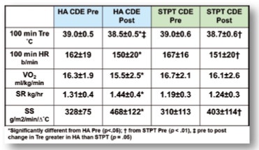We measured core and skin temperature, heart rate, VO2, cutaneous blood flow, thyroxine, lactate, sweat rate – corrected for fluid intake, urine output, respiratory water loss, and carbon weight loss, and fluid intake – measured aliquots of 6 % carbohydrate beverage at 3, 20, 32, 47, 63, and 80 minutes to replace 100 % of sweat production during all tests and trials. HA treatment was ten consecutive days of walking 100 minutes per day at 25 % VO2 max in 43.3 °C DB / 50 % RH, 33 mmHg VP, 1.8 m/s air speed. Subjects wore shorts and footwear and had full fluid replacement each trial. STPT treatment was ten consecutive days of 40 minutes treadmill interval running per day at 85 %-105 % VO2 max in 22 °C DB / 45 – 55 % RH, 9.9 mmHg VP, 1.8 m/s air speed. Subjects wore shorts and footwear. Pre- and post-CDE Tests were 100 minutes walks at 25 % VO2 max in 30 °C DB / 50 % RH (elicited 32 mmHg VP in the CDE micro-environment), 1.8 m/s air speed. The hot-humid HA treatment environment matched the VP in the CDE microenvironment. STPT increased VO2 max (8 %), and both HA (6 %) and STPT (10 %) increased plasma volume. CDE 1 vs CDE 2 test responses are shown in Table 1.