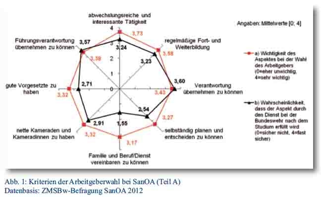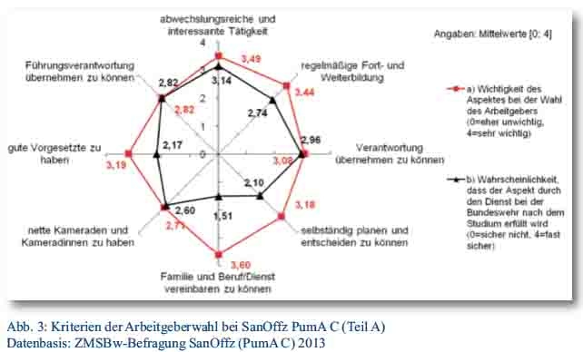 - Fähigkeitsfördernde Strategien: Der Sanitätsdienst der Bundeswehr erhält gute bis sehr gute Noten in den Attraktivitätsfeldern „Fort- und Weiterbildung“, „medizintechnische Ausstattung im Krankenhaus“ und „fachliche Qualifikation der vorgesetzten Ärzte“ im Vergleich zum konkurrierenden zivilen Gesundheitssektor. Komparative Vorteile dieser Art sollten in der Personalwerbung auch entsprechend proaktiv herausgestellt werden.