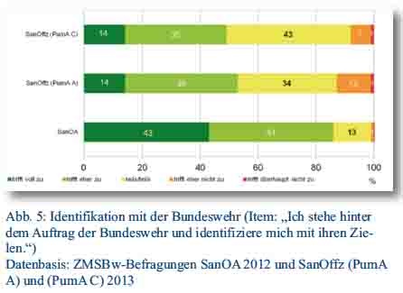 Abb. 5: Identifikation mit der Bundeswehr (Item: „Ich stehe hinter dem Auftrag der Bundeswehr und identifiziere mich mit ihren Zielen.“) Datenbasis: ZMSBw-Befragungen SanOA 2012 und SanOffz (PumA A) und (PumA C) 2013