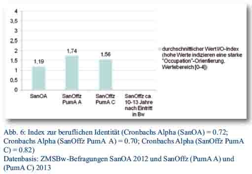 Abb. 6: Index zur beruflichen Identität (Cronbachs Alpha (SanOA) = 0.72; Cronbachs Alpha (SanOffz PumA A) = 0.70; Cronbachs Alpha (SanOffz PumA C) = 0.82) Datenbasis: ZMSBw-Befragungen SanOA 2012 und SanOffz (PumA A) und (PumA C) 2013