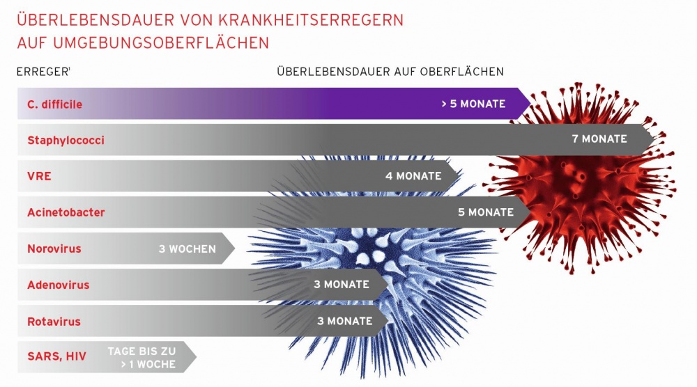 Während der letzten zehn Jahre konnte wissenschaftlich nachgewiesen werden, dass die Kontamination von Umgebungsoberflächen mit z.B. Clostridium difficile eine wichtige Rolle bei der Übertragung schwerer Krankenhausinfektionen, spielen.1