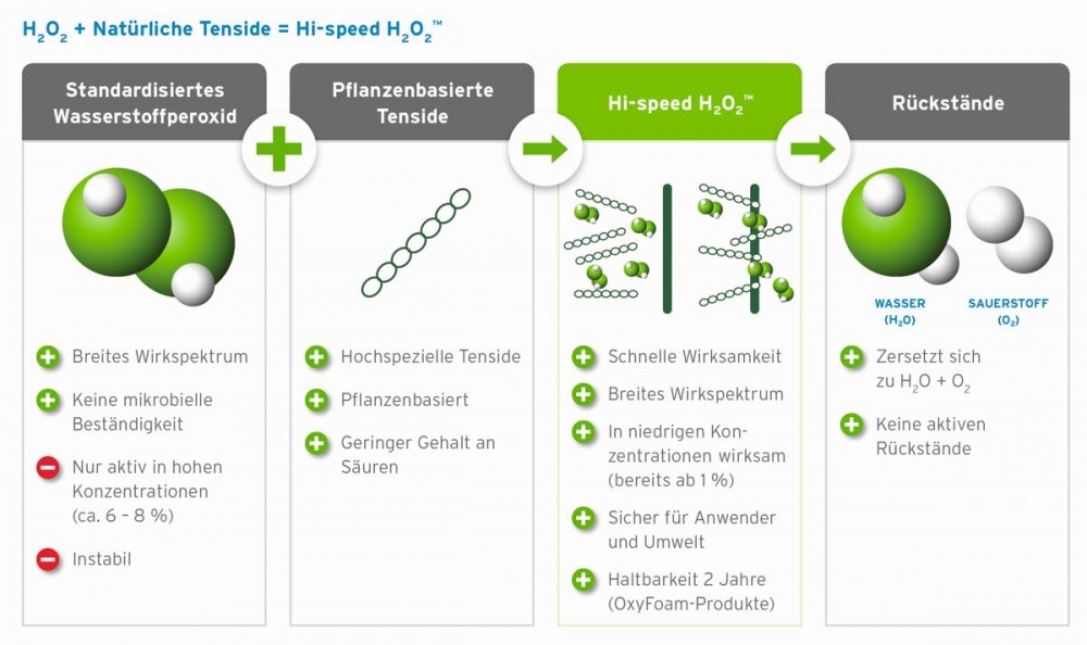 Die speziellen pflanzenbasierten Tenside in den auf Hi-speed H2O2™ basierenden Produkten ermöglichen es dem Wasserstoffperoxid in diesen Formulierungen, schneller und effektiver in Mikroorganismen einzudringen als das normale Wasserstoffperoxid. Aus diesem Grund sind zur Desinfektion nur geringe Mengen an Wasserstoffperoxid (abhängig vom Produkt 1,0 – 1,5 %) erforderlich. Bei der Anwendung stellt Hi-speed H2O2™ in den Produkten eine sofortige Desinfektionswirkung sicher, bevor sie sich zu Wasser und Sauerstoff zersetzen, ohne aktive Rückstände auf der Oberfläche zu hinterlassen. Da die Produkte auch als wirksame Reiniger formuliert wurden, ist eine vorherige Reinigung der Oberfläche nicht erforderlich, wenn diese optisch sauber ist. Des Weiteren unterstützen geringe Mengen an natürlichen Säuren die Stabilisierung der Formulierungen.