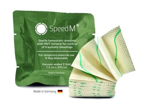 SpeedM® ist ein hämostatischer Notfallverband für die Akutversorgung traumatischer Wunden. Das Produkt besteht aus perforiertem Vliesstoff, der mit ultrafeinen Halloysiten beschichtet ist. Aufgrund ihrer morphologischen Struktur weisen Halloysite eine sehr große reaktive Oberfläche auf, wodurch die natürliche Gerinnungsreaktion des Körpers beschleunigt wird.