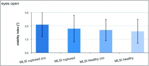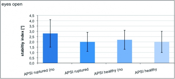 Vergleicht man jedoch die Gesamtstabilitätsindizes von verletztem (2,9 ± 1,3°) und gesundem (2,8 ± 1,3°) Bein jeweils mit Bandage, so findet sich kein signifikanter Unterschied mehr (p = 0,43).