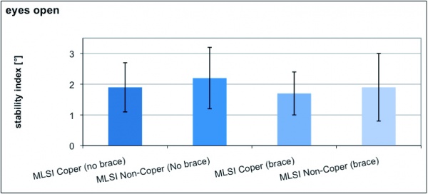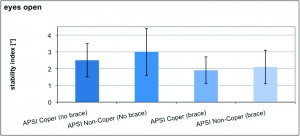 Conclusions: We demonstrated for the first time that elastic knee braces increase postural stability by approximately 22 % in patients with ACL rupture. Under braced conditions there was no difference in postural stability between healthy and injured legs. We postulate that improvement of postural control may be induced by enhancement of propriocepotion in the joint. The number of cases was not sufficient for statistical analysis of the detected difference between the two subgroups Coper and Non-Coper.