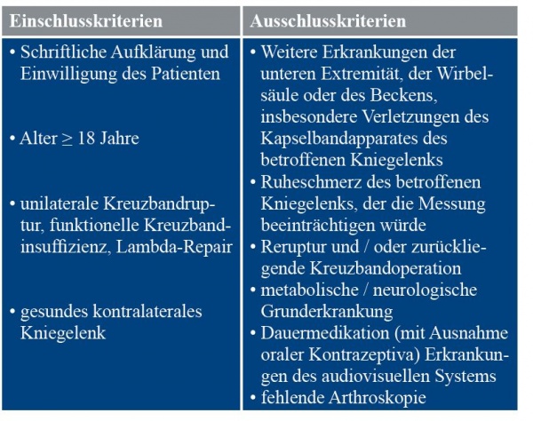 Unser Studienkollektiv umfasste 65 jüngere Patienten (26,5 ± 8,0 Jahre; 175,9 ± 23,1 cm; 82,3 ± 11,5 kg) entsprechend des soldatischen Zielkollektives. Hiervon waren 60 männlich und 5 weiblich. Basierend auf klinischer Untersuchung und MRT des betroffenen Kniegelenks war bei allen Probanden die Indikation zur diagnostisch-therapeutischen Arthroskopie und VKB-Ersatz gestellt worden. Neben der Anamnese wurde eine standardisierte Untersuchung des Stütz- und Bewegungsapparates durchgeführt. Im Anschluss erfolgte die Messung des Stabilitätsindex mittels computergestützter dynamischer Posturographie (CDP). Bei allen Patienten wurde am Folgetag die Arthroskopie durchgeführt. In diesem Rahmen erfolgte auch die endgültige Bestätigung oder der Ausschluss einer VKB-Ruptur. Daraufhin wurde über die definitive Aufnahme in die Studie unter Berücksichtigung der Ein- und Ausschlusskriterien (Tabelle 1) entschieden. sechs Patienten wurden im Nachhinein von der Studie ausgeschlossen, da sie eine zusätzliche Verletzung von Strukturen der unteren Extremität (z. B. frühere Ruptur des kontralateralen VKB) aufwiesen. Bei einem Patienten stellte sich arthroskopisch ein intaktes vorderes Kreuzband dar. Somit konnten 58 Patienten (54 männlich, vier weiblich; 25,9 ± 7,6 J; 175,8 ± 24,4 cm; 81,9 ± 12,0 kg) in der Studie verbleiben. Des Weiteren waren lediglich sieben Patienten älter als 30 Jahre. Dies liegt zum einen am relativen Verteilungsmuster von VKB-Rupturen mit Häufung bei sportlich aktiven Männern und zum anderen daran, dass wir als Militärklinik ein großes Kollektiv junger, männlicher Patienten versorgen.