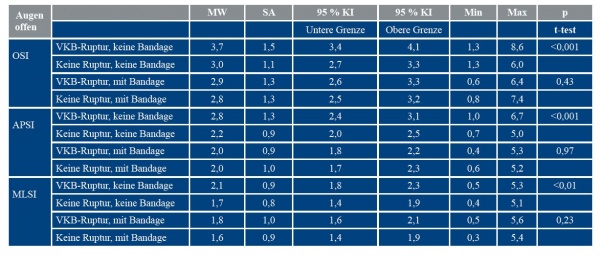 Beim gesunden Bein war der OSI ohne Bandage 3,0 ± 1,1°. Mit Bandage wurde ein OSI von 2,8 ± 1,3° gemessen (p = 0,17).