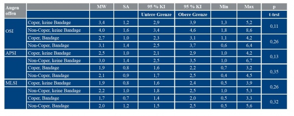 Innerhalb der Gruppe der Coper verbesserte sich der OSI von 3,4 ± 1,2° ohne das Tragen der Bandage auf 2,7 ± 1,0° mit angelegter Bandage (p < 0,001). Dies entspricht einer Verbesserung um 20,6 %.