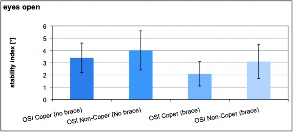 Bei den Non-Copern betrug der OSI ohne Bandage 4,0 ± 1,6°, mit Bandage war er 3,1 ± 1,4° (p < 0,001), was einer Stabilitätserhöhung von 22,5 % durch das Tragen einer elastischen Kniegelenksbandage entspricht.