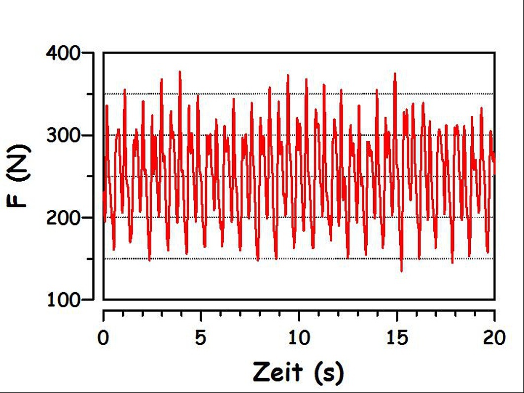 Die Transportaufgaben zeigen eindeutig, dass Personen mit geringen Muskelkräften kaum in der Lage sind, Verletzte über Distanzen von 100 – 150 m zu transportieren. Dies gilt insbesondere für die teilnehmenden Soldatinnen. Sie erreichten nur eine maximale Greifkraft von 399 ± 53 N und damit etwa 63 % des Kraftniveaus der Männer (630 ± 116 N). Dies führt beim Tragetransport zwangsläufig zu einer erheblich höheren Beanspruchung der Probandinnen und zu der unproportional kürzeren Transportdistanz von lediglich 101 m (nur gut 1/3 der Distanz der Männer). Zurückzuführen sind die geringen Trageleistungen der Frauen vor allem auf die hohen Kraftbelastungen beim Transport (Abbildung 2). Die an den Trageholmen auftretenden Kraftspitzen von über 350 N führen bei Frauen zu der ungleich höheren Beanspruchung und werden durch die synchron zur Schrittfrequenz auftretenden vertikalen Bewegungen der Trage verursacht [18, 19].