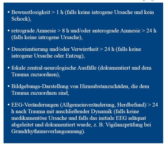 Ärztliche Dokumentationen der Akutbehandlung machen oft keine genauen Angaben über Tiefe und Dauer einer Bewusstseinsstörung bzw. über Verwirrtheit, Desorientiertheit oder andere psychische Auffälligkeiten. Der Nachweis länger dauernder Bewusstlosigkeit, Amnesie oder Verwirrtheit scheitert oft an Erfordernissen der Behandlung (Sedierung, Beatmung, operative Versorgung). Ein unauffälliger somatisch-neurologischer Befund schließt eine “substanzielle Hirnschädigung“ nicht aus. Besondere Bedeutung kann ein möglichst früh (am Besten innerhalb von 24 Stunden nach Ereignis) und adäquat abgeleitetes EEG gewinnen, wenn z. B. der Vergleich mit späteren Ableitungen eine Grundrhythmusverlangsamung oder einen sich rückbildenden Herdbefund ergibt. Allerdings ist in diesem Fall auszuschließen, dass die EEG-Veränderungen durch die Gabe von Arzneimitteln bedingt waren.
