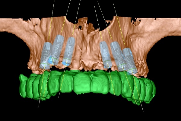 Im Oberkiefer konnten mit der Planungssoftware SkyPlanX der Firma Bredent 6 Implantate mit BoneSplit geplant werden (Abb. 2), im Unterkiefer war eine Implantation aufgrund ungenügenden Knochenangebots nicht möglich.