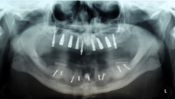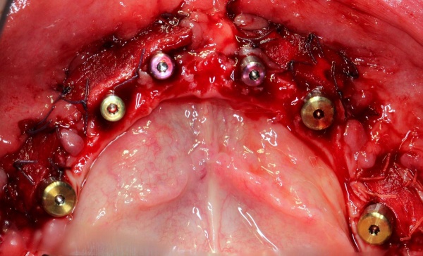 Nach achtwöchiger Ausheilzeit wurde im Mai 2012 eine 3D-Planung der Implantation bei unklarem Knochenangebot durchgeführt. Hierzu erfolgte bei Zahnlosigkeit zur Verankerung der Planungsschablonen im Juni 2012 die Insertion von drei Miniimplantaten im Oberkiefer und drei Miniimplantaten im Unterkiefer. Zur besseren Stabilisierung der schon vorhandenen Totalprothesen wurden Druckknöpfe in die Prothesen eingebracht. Nach Herstellung der Planungsschablonen wurde Ende Juni 2012 eine Denta-CT durchgeführt.